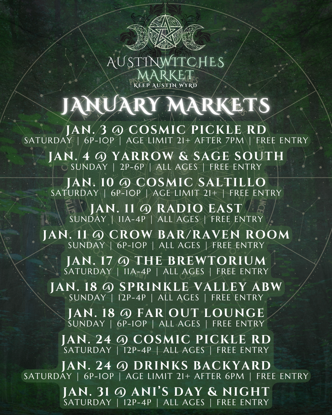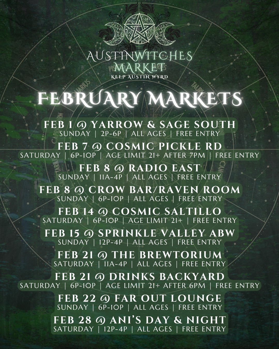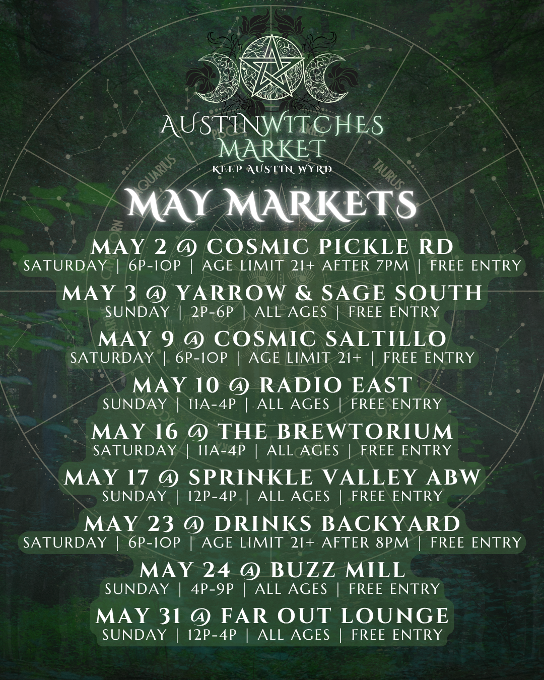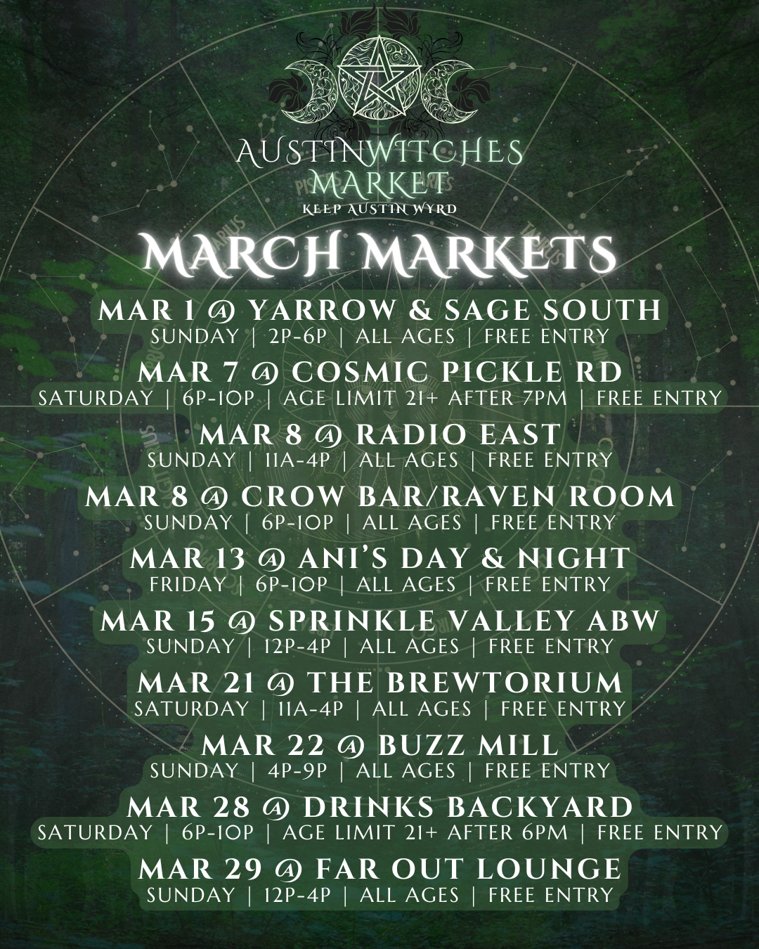 View Upcoming MarketsThe owner of Yarrow & Sage has been independently organizing the Austin Witches Markets since 2015! These events showcase a rotating roster of over 200 local artists, herbalists, makers, and creators who specialize in witchcraft, magick, herbalism, spiritual readings, and handmade artisan goods.